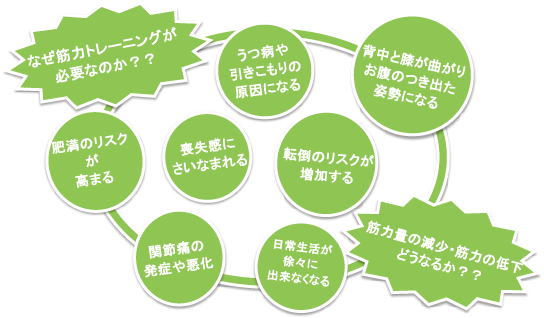 当施設は、筋肉量の減少に伴って基礎代謝が減少し、その結果、太りやすい体質になったり、体重が増加することで糖尿病等の生活習慣病のリスクが高まるのを抑制するため適度な運動を同じ目的でみんなで一緒に楽しく行ってもらうのが目的です。