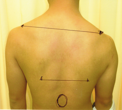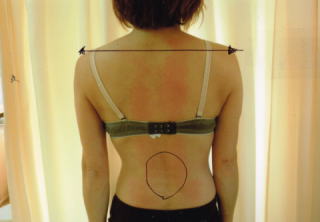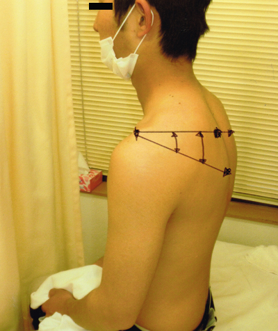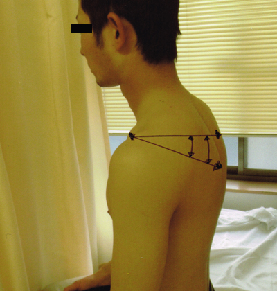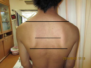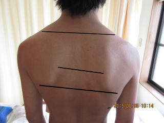 肩甲骨の位置が左右不均等になっている。