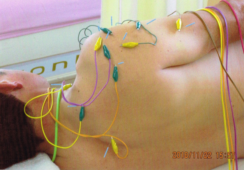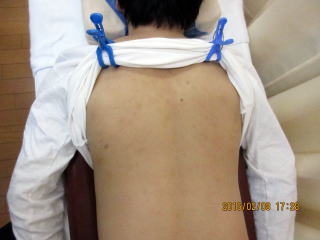 低周波等を行い胸椎の前方変位、側屈変位に対し、矯正施術ならびに