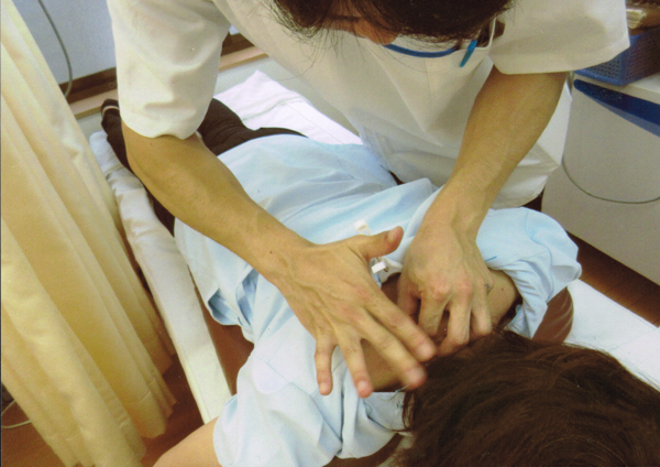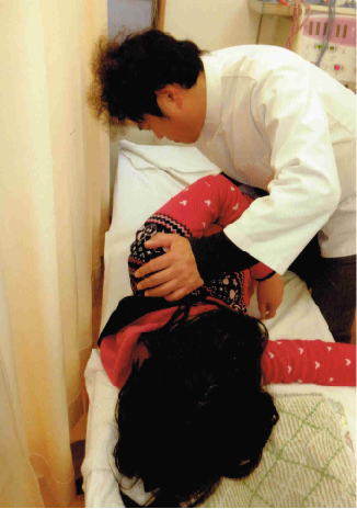 写真1 まず最初に全身の緊張している筋組織に対しマッサージ療法を行う。