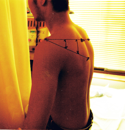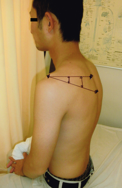 「解説」のとおり@〜Gの施術を施行、写真@AよりBの写真の通り肩甲骨下角が確認できる