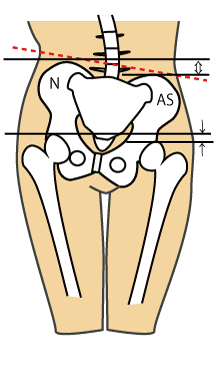 1、触診による大腿骨頭の頂点に水平線を引き他方の低い側の大腿骨に向かい延長し計測する。